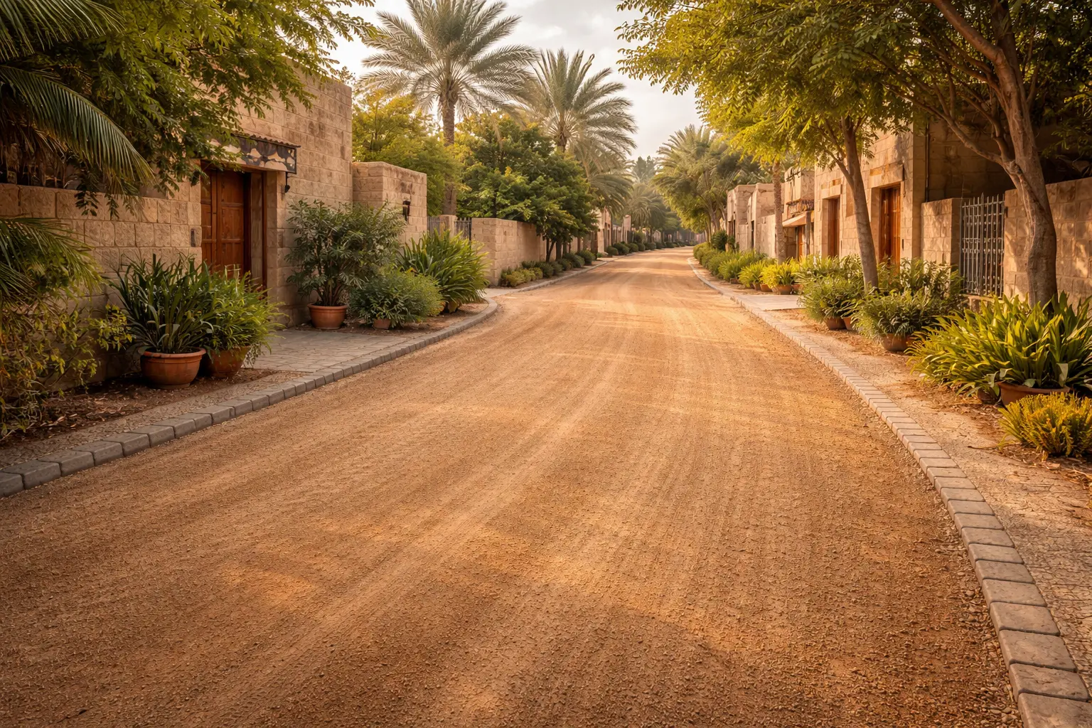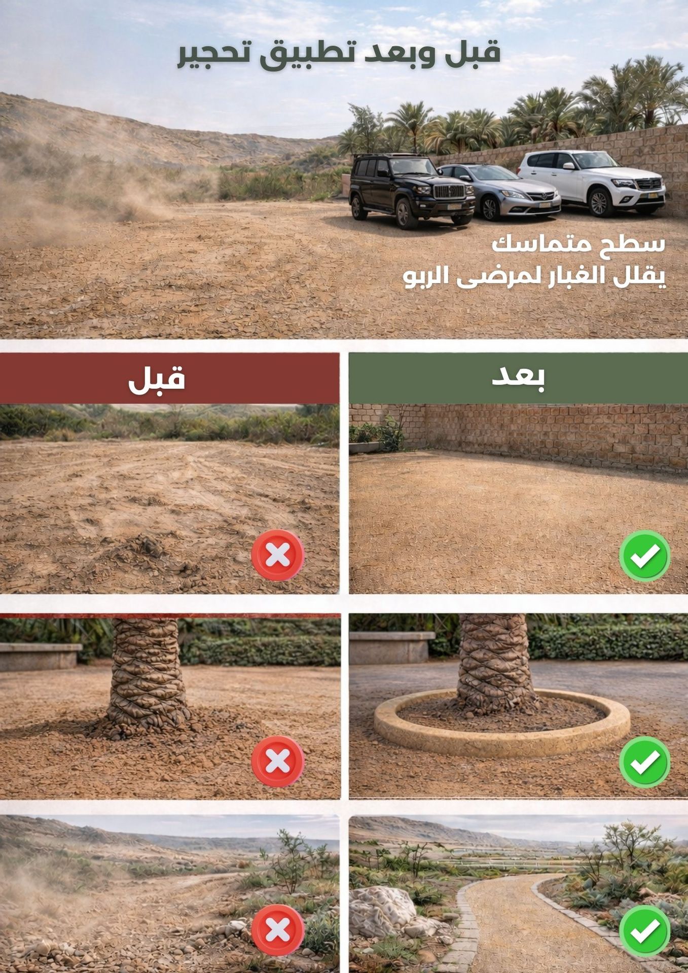 Tahjeer is used to stabilize soil in gardens and unpaved pathways around homes, helping to reduce dust dispersion, enhance the appearance of the area, and maintain ground stability for a longer period.