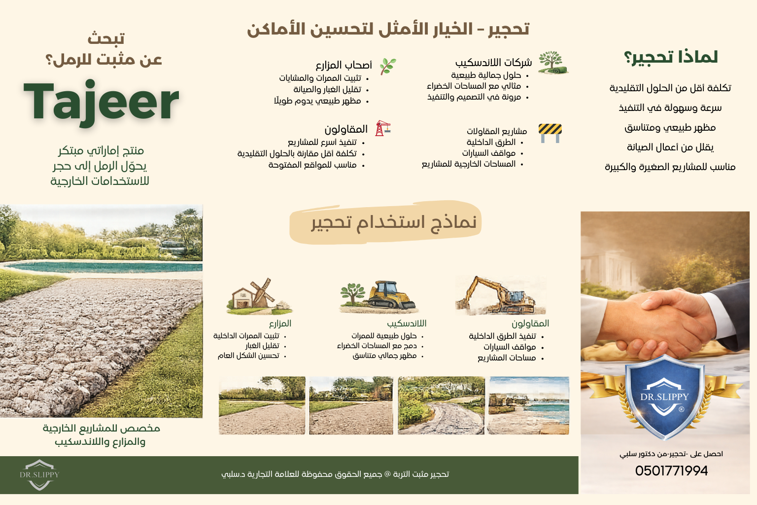 هو مثبّت تربة ورمال يُستخدم لتثبيت الرمال في الأراضي، الطرق، والحدائق، بهدف تقليل الانجراف والتآكل، وتحسين متانة واستقرار سطح الأرض.تحجير