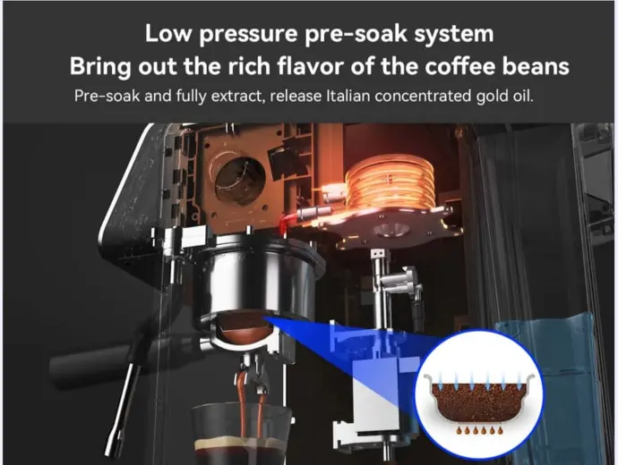 نظام يبرز النكهة الغنية لحبوب القهوة، انقعها مسبقًا واستخلصها بالكامل، ثم الاستخلاص بنقاوة الزيت مع المضخة الإيطالية المركزية.
