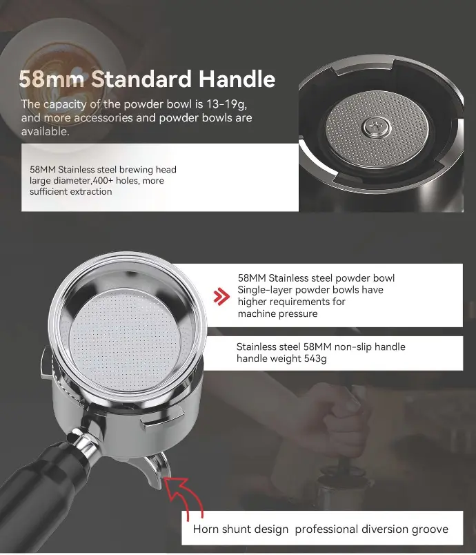 مقبض قياسي 58 مم. سعة وعاء المسحوق هي 13-19 جم، وتتوفر المزيد من الملحقات وأوعية المسحوق.